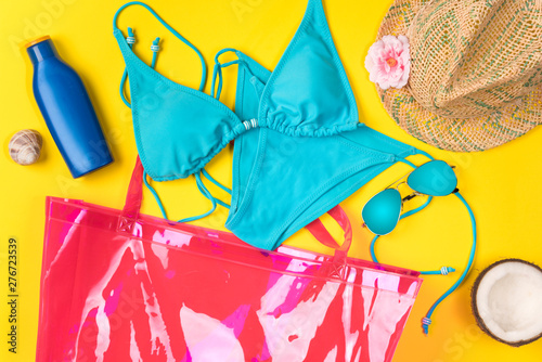 summer, bag, beach, view, top, background, accessory, yellow, vacation, hat, fashion, travel, style, blue, season, sunglasses, holiday, object, nobody, tour tourism, relaxation, bright, sea, design, concept, sunny, coconut, clothes, flat, straw, female, decoration, woman, modern, closeup, goggles, creative, tropical, relax, stylish, sun, pink, swimwear, sunblock, sunblock, skin, summer, marin, tube