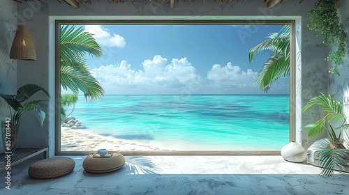 Beachfront View: A window overlooking a pristine beach, with turquoise waters and palm trees swaying gently in the breeze, evoking a sense of relaxation and escape. Illustration, Minimalism,