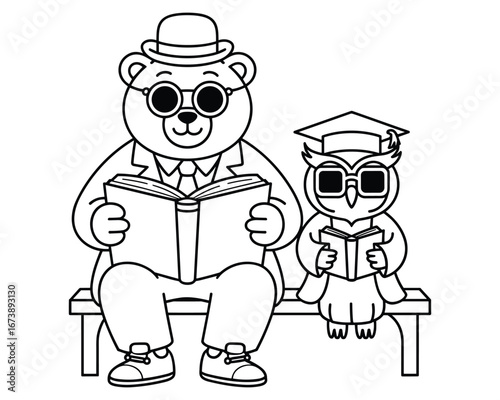 bear, owl, cartoon, reading, book, bench, education, learning, cognition, wisdom, goggles, hat, attaching, suit, animal, wildlife, illustration, drawing, black-and-white, line art, character, student, teacher, scholar, intellectual, park, outdoors, leisure, quiet, focused, companion, friendship, study, academic