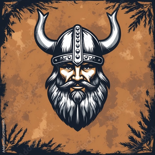 Bearded viking warrior face with horned helmet on textured brown background with black border, hand-drawn vintage style illustration