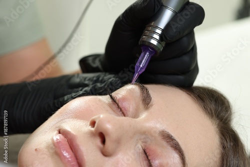 adult, applying, background, beautician, beautiful, beauty, brow, care, caucasian, closeup, colours, contour, cosmetic, cosmetician, cosmetologist, cosmetology, eye, eyebrow, face, fashion, female, glove, hand, indoor, ink, machine, macro, constructed, make-up, making, master, model, needle, people, permanent, pigment, procedure, process, professional, salon, shape, spa, tattooed, tool, treatment, up, woman