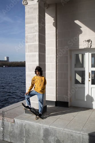 apparel, appoint, architecture, autumn, beautiful, building, city, curly, embankment, footwear, fun, coiffure, jean, jumping, landscape, lifestyle, nature, outdoors, pant, park, portrait, river, skate, skateboard, skater, sport, sport, street, stylish, travel, urban