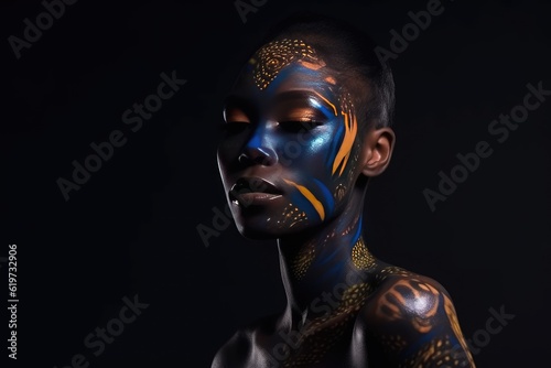 Beautiful African woman with black skin body art. Generative AI