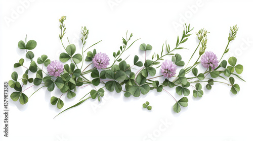 leaf, flower, purple, green, botanical, arrangement, nature, floral, clover, delicate, aesthetic, greenery, plant, decoration, spring, summer, vibrant, fresh, organic, design, beauty, natural, garden, wildflower, herb, foliage, blossom, elegant, artistic, composition, peaceful, harmony, texture, detail, background, seasonal, growth, landscape, environment, calmness, lush, colourful, creative, visual, style, unique, art