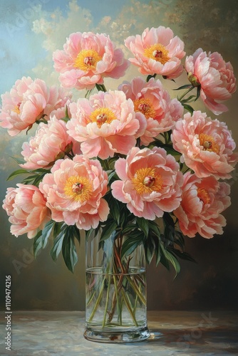 Beautiful Arrangement of Soft Pink Peonies in a Transparent Vase Against a Subtle Colorful Background Making a Stunning Floral Display for Home Decor