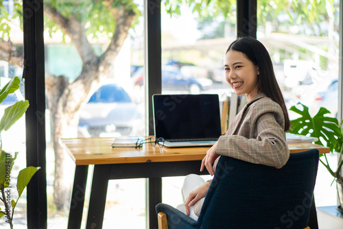Beautiful Asian girl side view celebrates with successful laptop happily ecommerce university study internet technology or start up small business ideas
