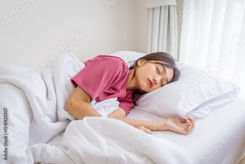Beautiful Asian woman sleeping peacefully in cozy bedroom during morning. Young female enjoying sweet dreams and relaxing in bed, showing comfort, rest, and healthy sleep at home, wellness concept.