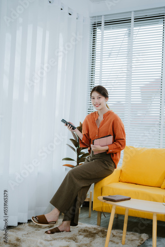 Beautiful Asian woman smiling happily while playing social media on her mobile phone at home.