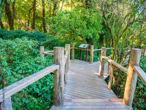 Beautiful Autumn forest nature. Vivid morning in colorful forest with sunlight rays trough branches of trees. Scenery of Plant with sun outdoor in Thailand. Green forest springtime season.