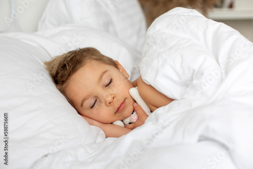 Beautiful blond toddler child, boy, sleeping in bed with teddy bear toy