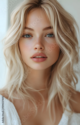 Beautiful blonde woman with wavy hair posing for the camera, light background, hair is perfectly styled and voluminous, her eyes are blue in color