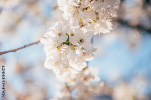 Beautiful blossoming tree on spring season. Close-up photo with great golden hour light.