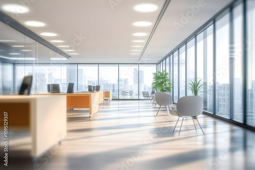 Beautiful blurred background of a light modern office interior with panoramic windows and beautiful lighting.