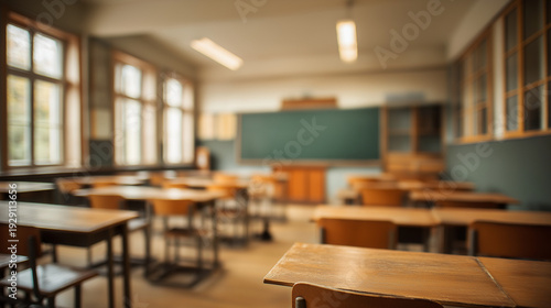 Beautiful Blurred Bright Classroom Interior with Panoramic Windows – Empty School Background