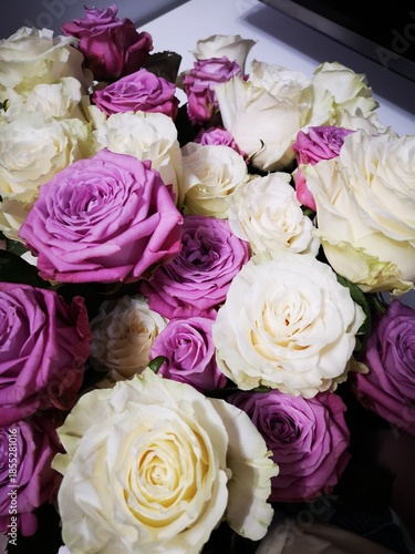 Beautiful bouquet of mixed roses featuring vibrant purple and soft white blooms, arranged elegantly, showcasing the delicate petals and lush greenery in a stunning floral display