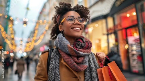 beautiful brunette woman shopping with a smile on the street with scarf and bags