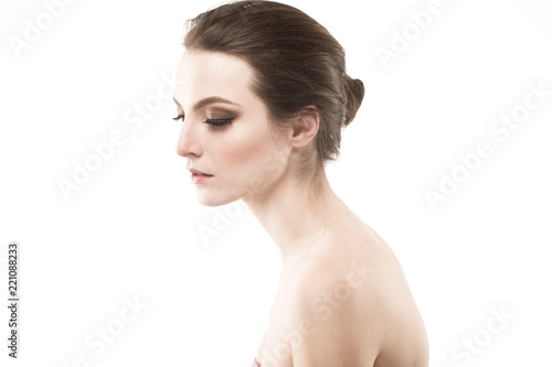 woman, beauty, beautiful, face, portrait, young, skin, white, isolated, model, care, clean, natural, head, skincare, fashion, hair, 1, naked, healthy, closeup, fresh, body, make-up, studio, curly, long, girl, coiffure, wavy, style, brown, brunette, female, glamour, eye, salon, colours, background