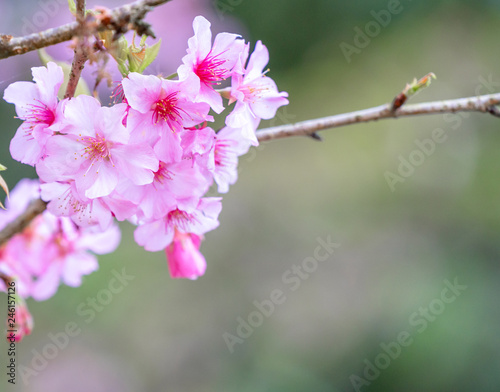 Beautiful cherry blossoms sakura tree bloom in spring in the park, copy space, close up.