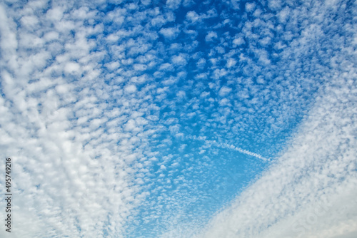 beautiful clouds against the blue sky,High white cirrus clouds with cirro-stratus in a light blue sky, sometimes called stool tails, indicate fine weather, but stormy changes come within days.