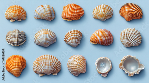 Beautiful collection of opened seashells with pearls, showcasing various colors and patterns. Perfect for marine themed designs or educational materials