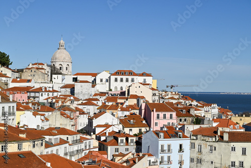 Beautiful colorful and vibrant cityscape of Lisbon, Portugal. Church of Sao Vicente of Fora (Igreja de Sao Vicente de Fora) and old buildings in Alfama and Graca districts in Lisbon, Portugal.