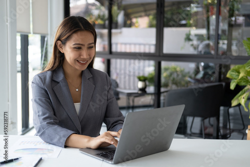 Beautiful confident businesswoman typing on laptop computer while working at her office desk.