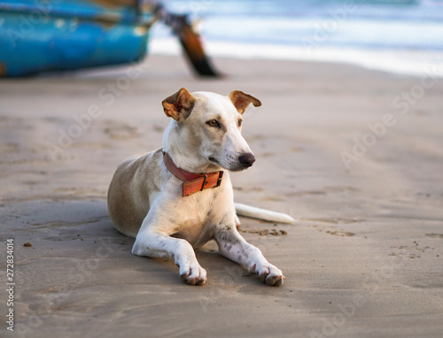 Beautiful dog by the sea or ocean. An animal on the shores of the Indian Ocean in Shrilanka. The pet walks free.