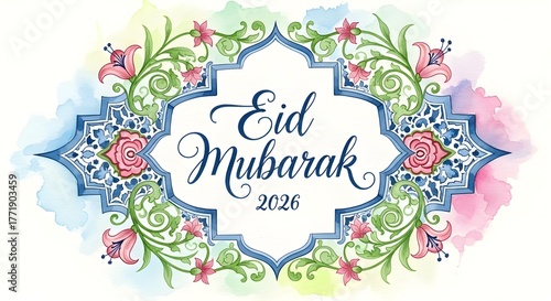 Beautiful eid mubarak 2026 greeting card with floral watercolor frame and intricate blue islamic geometric pattern, celebrating the islamic festival of sacrifice and joy