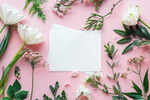 Beautiful Floral Arrangement Around Blank Card on Pink Background - Generative AI
