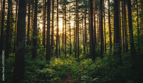 Beautiful forest landscape with tall trees and lush foliage. The scene is bathed in soft, natural light filtering through the leaves of towering trees, creating an enchanting atmosphere