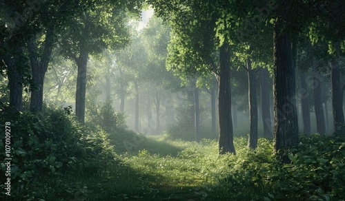 Beautiful forest landscape with tall trees and lush foliage. The scene is bathed in soft, natural light filtering through the leaves of towering trees, creating an enchanting atmosphere