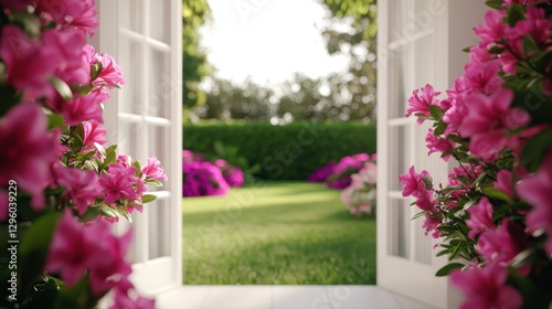 Beautiful Garden View Framed by Blossoming Flowers and Open Doors