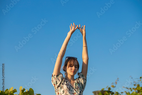beautiful girl against the sky. arms raised lightly above the head against the sky. feminine gentle hands. photo for advertising cosmetic services. A beautiful fashion model girl enjoys nature, b