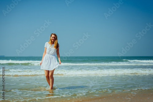 beach, woman, sea, young, summer, ocean, sand, beautiful, water, vacation, coast, happy, sky, holiday, beauty, dress, running, blue, white, 1, tropical, people, person, fun, travel