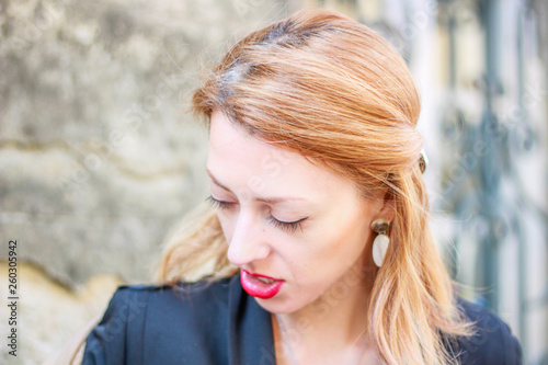Beautiful girl on a sunny day. Dressed in classic style. Epoxy decorations. Bijouterie, earrings, ring, brooch. L'viv. Ukraine