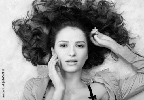 girl, model, fur, fashion, caucasian, female, beautiful, beauty, people, face, white, portrait, hair, cute, style, studio, lifestyle, attractive, woman, european, vogue, blue, shirt, lingerie, underclothing, underclothes, grey, long-haired, brown-haired, hand, young, black, black-and-white, greyscale, monochrome, lie, lying, relax