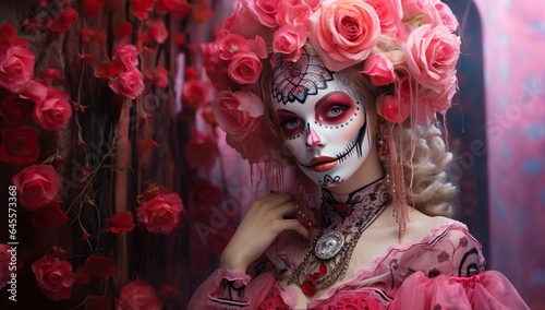 day of the dead, woman, flower, hair, beauty, carnival, halloween, fantasy, make-up, pink, make up, face, gothic, skeleton, fashion, decoration, death, horror, beautiful, girl, portrait, beautiful girl, artistic, creative, festive, celebration, floral, feminine, symbolic, culture, ethnic, coiffure, ornamentation, festivity, colourful, tradition, symbolism, expression, youth, adornment, ritual, floral arrangement