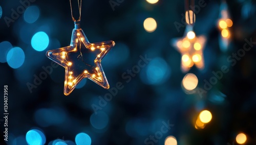 star, ornament, christmas, festive, holiday, decoration, glowing, light, blue, bokeh, background, shimmering, celebration, seasonal, sparkle, bright, shiny, transparent, warm, cosy, mood, cheer, winter, tradition, joy, beauty, glow, tree, blurred, evening, atmosphere, hanging, colourful, radiance, illumination, season, artistic, creative, magical, environment, decorative, light, twinkle