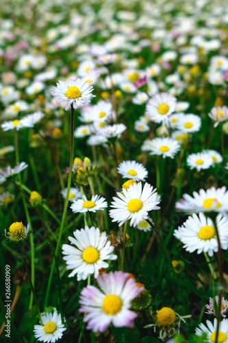 Beautiful green summer meadow with wildflowers in bloom. Camomile field background. Blossoming daisies clearing. Selective focus