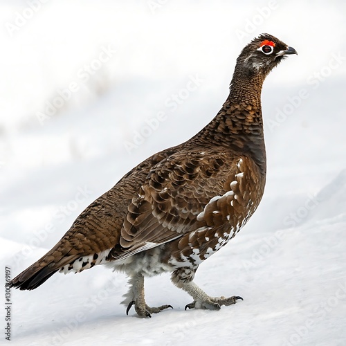 Beautiful grouse bird with intricate feathering and red eyes, standing proud in the snow with an elegant and minimalistic white environment