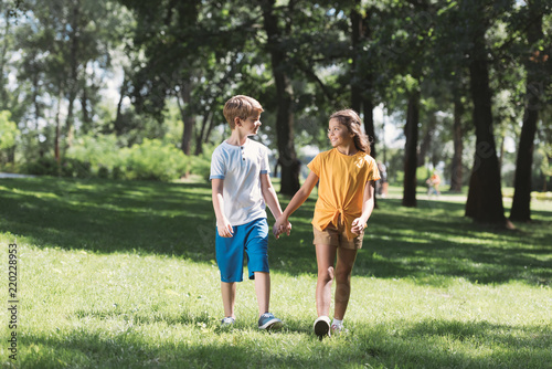 beautiful happy children holding hands and walking together in park
