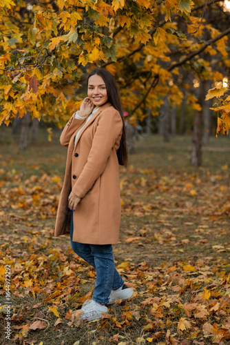 Beautiful happy young girl in brown coat in autumn park. autumn day. fall season. fall