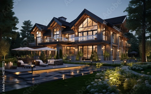 housing, home, exterior, estate, residential, property, architecture, building, green, grass, landscape, lawn, luxury, garden, dwelling, villa, new, modern, entrance, design, sky, country, contemporary, construction, patio, expensive, beautiful, garage, chalet, project, lifestyle, stock, concept, style, illustration, evening, wood, neighbourhood, perspective, door, custom, yard, view, ai