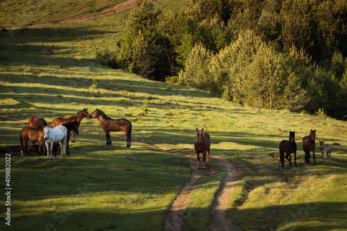 Beautiful horses on a green landscape. Comanesti, Romania.
