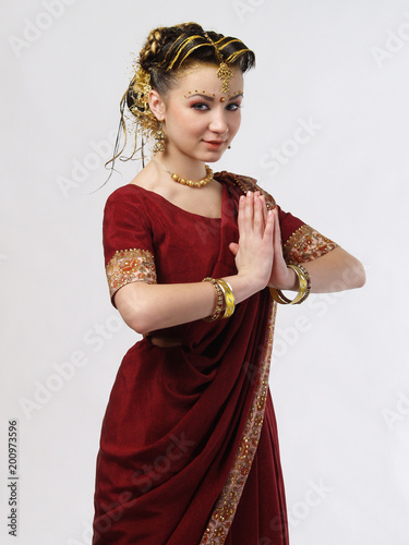 Beautiful Indian girl. A woman in an Indian outfit, costume, sari isolated on white background