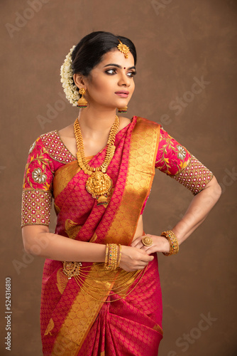 Beautiful Indian young Hindu Bride jewelry on studio shot.