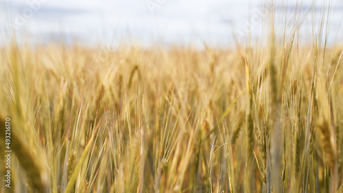 Beautiful landscape field on a summer day. Rural scene. Close up of wheat ears, field of wheat