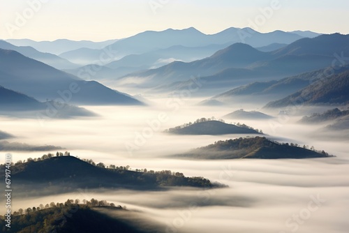 Beautiful landscape of mountains in foggy morning. Beauty in nature.