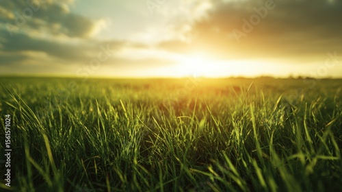 Beautiful lush green grass field under golden sunset with cloudy sky in the distance.