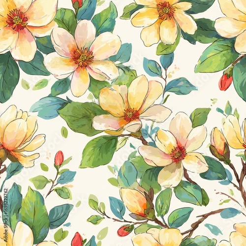 seamless, pattern, magnolia, flower, floral, blossom, bloom, leaf, leaf, botany, botanical, spring, summer, elegant, nature, watercolor, design, textile, fabric, background, painting, drawing, ornament, decoration, wallpaper, wrapping, scrapbooking, scrapbook, decorative, artistry, surface, print, artistic, detailed, vibrant, colourful, romantic, feminine, freshness, foliage, garden, gentle, pretty, stylised, creative, element